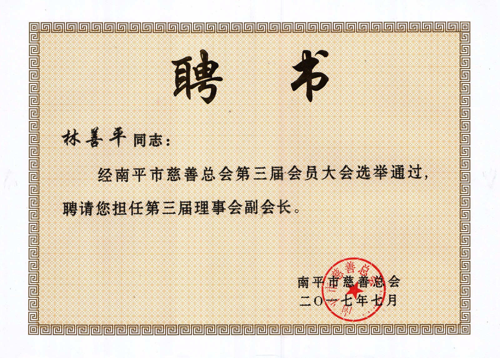 2017年7月28日,南平市慈善捐贈大會(huì )暨市慈善總會(huì )換屆會(huì )議在南平市委舉行,福建順昌虹潤董事長(cháng)林善平再次當選為南平市慈善總會(huì )第三屆理事會(huì )副會(huì )長(cháng),這也是林善平董事長(cháng)第三次當選此職。同時(shí),在本次慈善捐贈大會(huì )上,他再次向市慈善總會(huì )捐款50萬(wàn)元。他表示,他還將一如既往,繼續加大對社會(huì )公益事業(yè)的支持力度,積極投身公益和慈善事業(yè),為南平市的慈善事業(yè)作出更大的貢獻。目前,林善平董事長(cháng)各項公益捐款累計已達1000余萬(wàn)元。