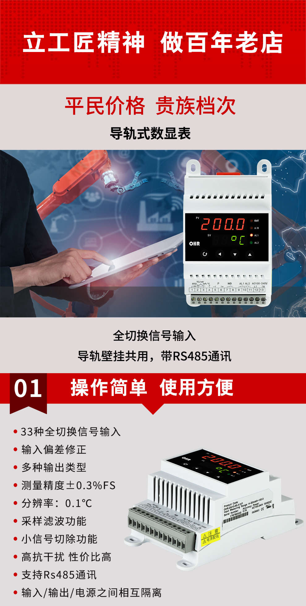虹潤公司是專(zhuān)業(yè)生產(chǎn)數顯表的國家專(zhuān)精特新“小巨人”企業(yè),生產(chǎn)的導軌式數顯儀表,具有全切換信號輸入,導軌壁掛共用,全隔離設計,高抗干擾,變送輸出或RS485通訊等特點(diǎn)。產(chǎn)品獲得巡回檢測顯示方法及裝置、工業(yè)模塊的導軌式安裝結構等2項國家發(fā)明專(zhuān)利,主持起草工業(yè)過(guò)程控制系統用模擬輸入兩位或多位輸出儀表、物聯(lián)網(wǎng)智能溫度儀表通用技術(shù)條件等2項國家標準,,以及通信系統多通道數據采集控制終端規范軍用標準,參與國際5G標準制定,取得簡(jiǎn)易數顯儀表等3項相關(guān)軟件著(zhù)作權。產(chǎn)品廣泛應用于電力、石化、冶金、化工、造紙、食品、輕工、制藥、熱處理、水處理、機械配套等各種工業(yè)現場(chǎng)。