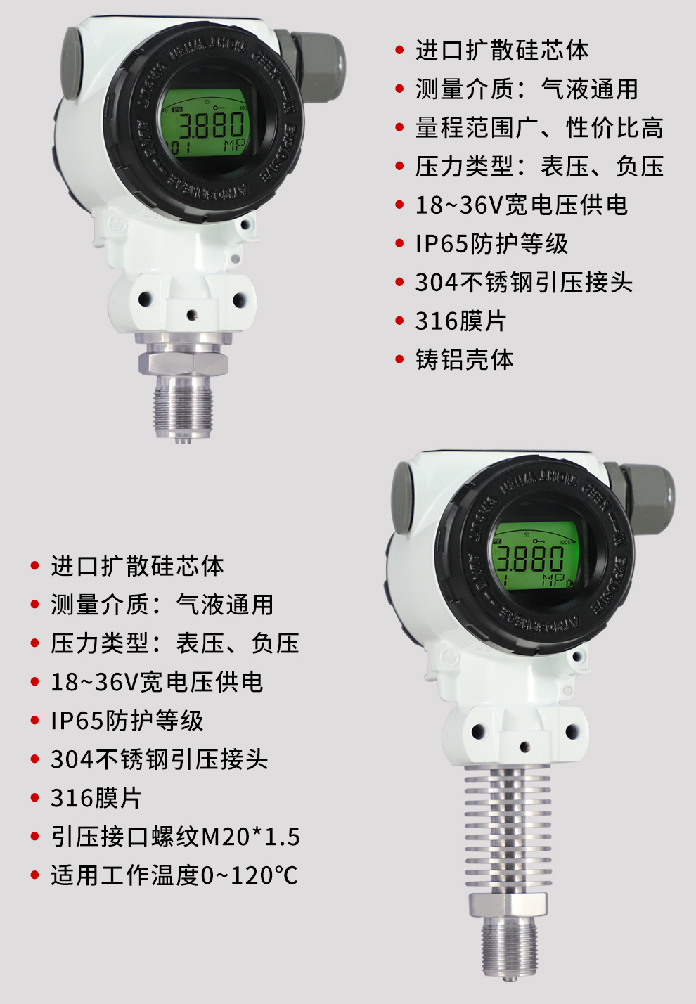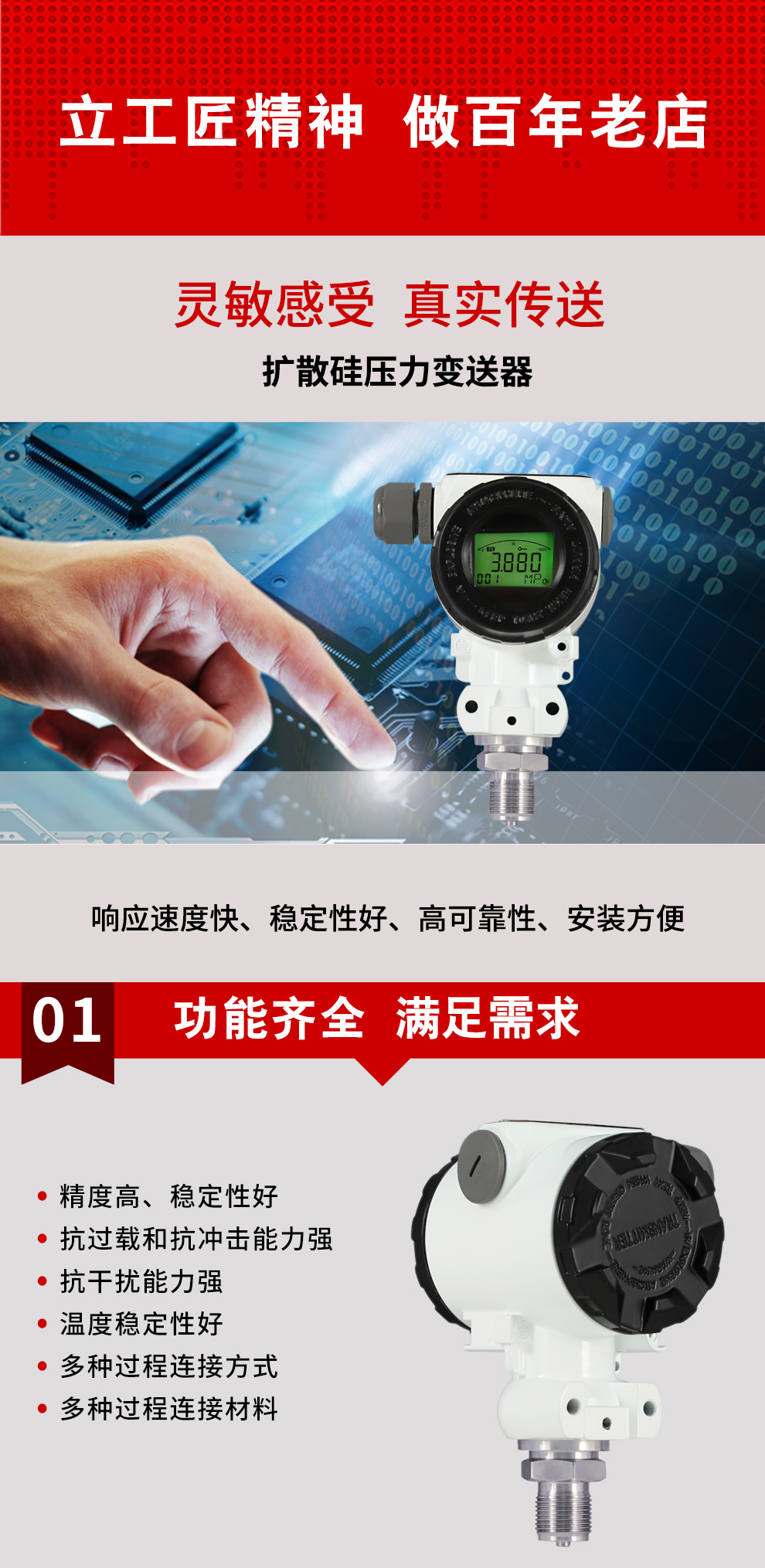 虹潤公司是專(zhuān)業(yè)生產(chǎn)壓力變送器的國家專(zhuān)精特新“小巨人”企業(yè),生產(chǎn)的擴散硅壓力變送器,具有精度高,穩定性好,響應速度快,高可靠性,抗過(guò)載和抗沖擊能力強,安裝方便等特點(diǎn)。產(chǎn)品獲得一種數字顯示低功耗壓力表、一種信號發(fā)生器裝置等2項國家發(fā)明專(zhuān)利,主持起草工業(yè)過(guò)程控制系統用模擬輸入兩位或多位輸出儀表、工業(yè)過(guò)程測量和控制系統用壓力/差壓變送器等2項國家標準,通信系統多通道數據采集控制終端規范軍用標準,以及現場(chǎng)設備集成等5項智能制造國家標準。參與國際5G標準制定,取得數顯壓力表等2項相關(guān)軟件著(zhù)作權。產(chǎn)品廣泛應用于化工、食品、制藥、電力、設備配套、供暖、水處理、樓宇等行業(yè),需精準測量流體壓力的現場(chǎng)。