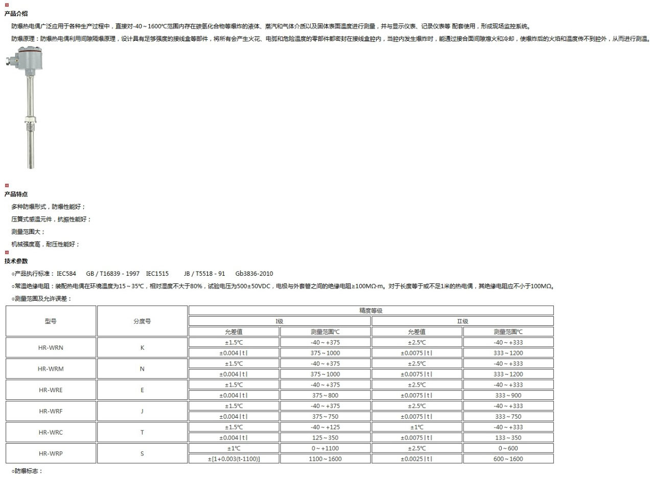 隔爆熱電偶是一種溫度傳感器,在化學(xué)工業(yè)自控系統中應用極廣,通過(guò)溫度傳感器,可將控制對象的溫度參數變成電信號,傳遞給顯示、記錄和調節儀,對系統施行檢測、調節和控制。在化工廠(chǎng),生產(chǎn)現場(chǎng)常伴有各種易燃、易爆等 化學(xué)氣體、蒸汽,如果使用普通的熱電偶非常不安全,極易引起環(huán)境氣體爆炸。