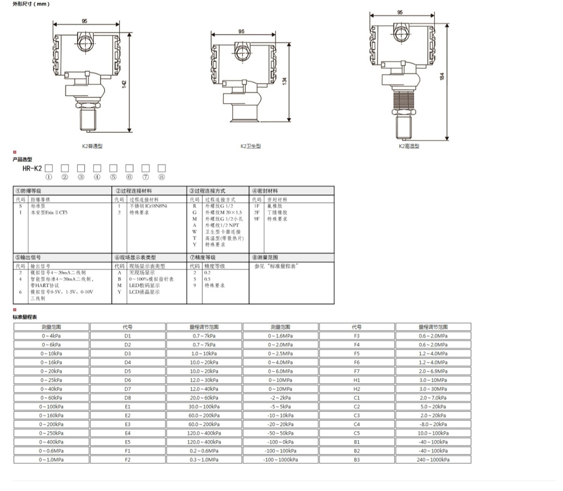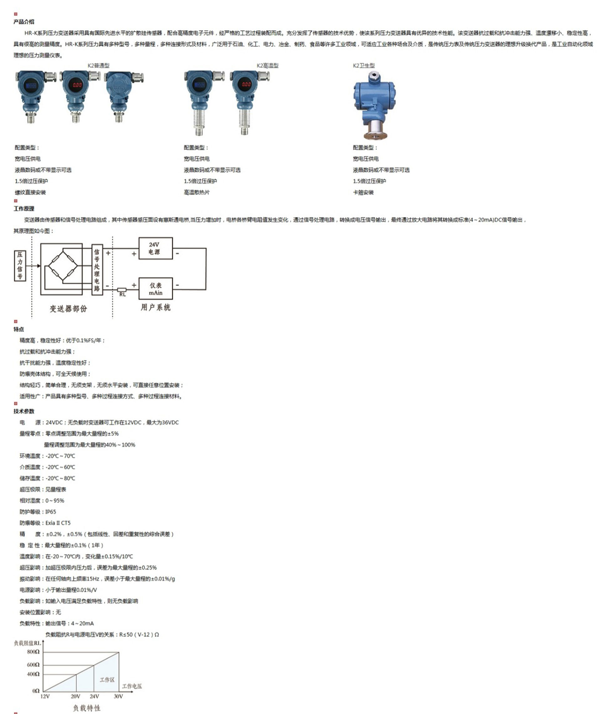 HR-K系列壓力變送器采用具有國際先進(jìn)水平的擴散硅傳感器,配合高精度電子元件,經(jīng)嚴格的工藝過(guò)程裝配而成。充分發(fā)揮了傳感器的技術(shù)優(yōu)勢,使該系列壓力變送器具有優(yōu)異的技術(shù)性能。該變送器抗過(guò)載和抗沖擊能力強、溫度漂移小、穩定性高,具有很高的測量精度。
