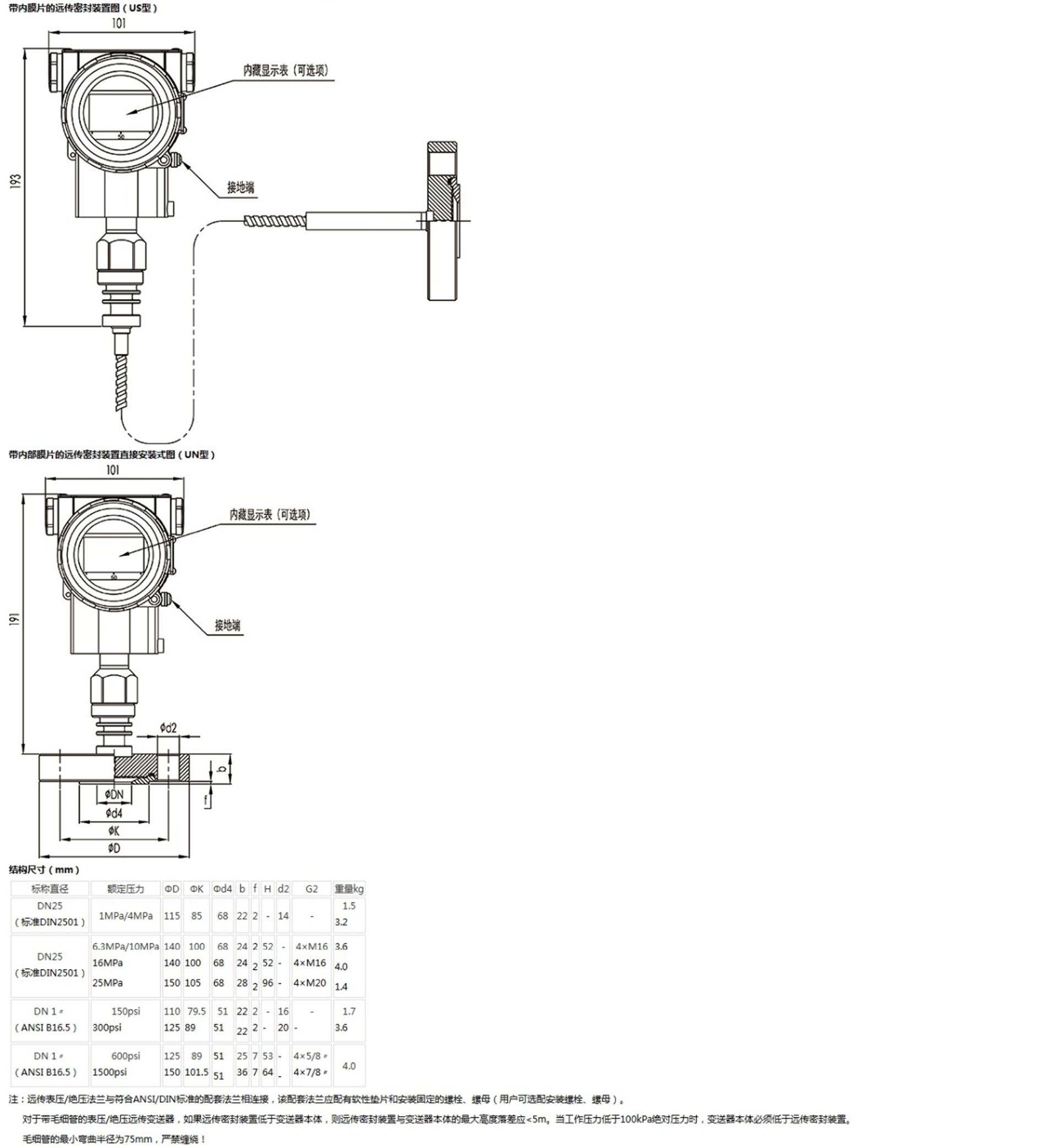該產(chǎn)品用于測量液體、氣體或蒸汽的液位、密度、壓力,將其轉變成4~20mA (HART)電流輸出信號,可通過(guò)RST375手持終端對它們進(jìn)行參數設定、過(guò)程監控等。測量范圍(未遷移時(shí))為0-6kPa~25MPa,液位法蘭的額定壓力分別為:1.6/4MPa、6.4MPa、10MPa、150psi、300psi或600psi。