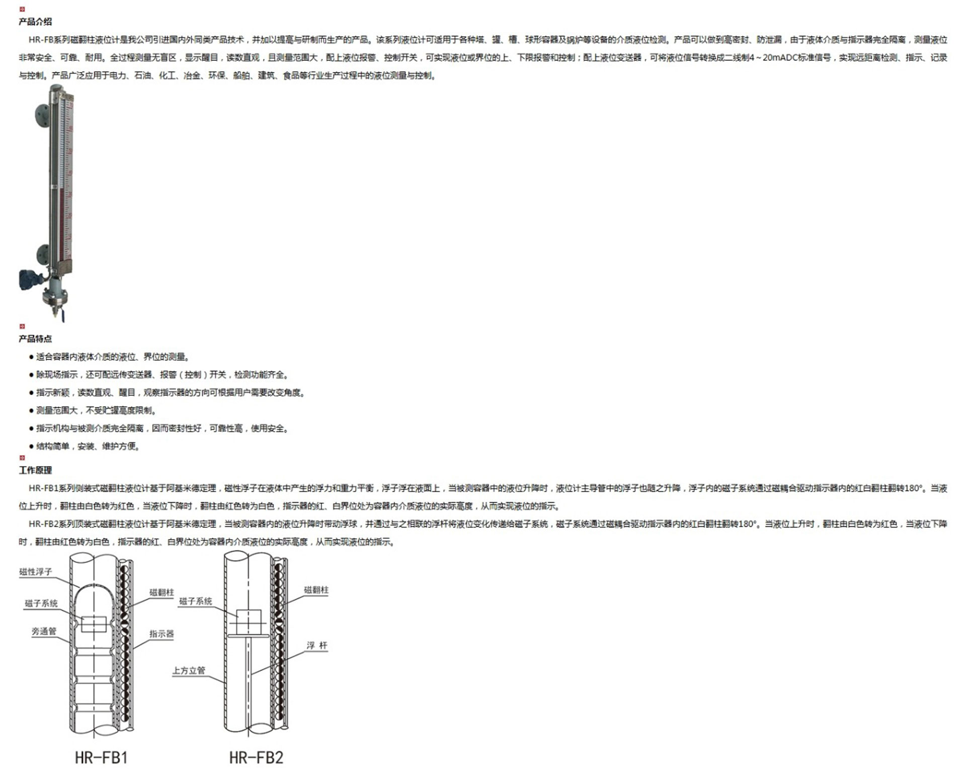 HR-FB系列磁翻柱液位計是我公司引進(jìn)國內外同類(lèi)產(chǎn)品技術(shù),并加以提高與研制而生產(chǎn)的產(chǎn)品。該系列液位計可適用于各種塔、罐、槽、球形容器及鍋爐等設備的介質(zhì)液位檢測。產(chǎn)品可以做到高密封、防泄漏,由于液體介質(zhì)與指示器完全隔離,測量液位非常安全、可靠、耐用。