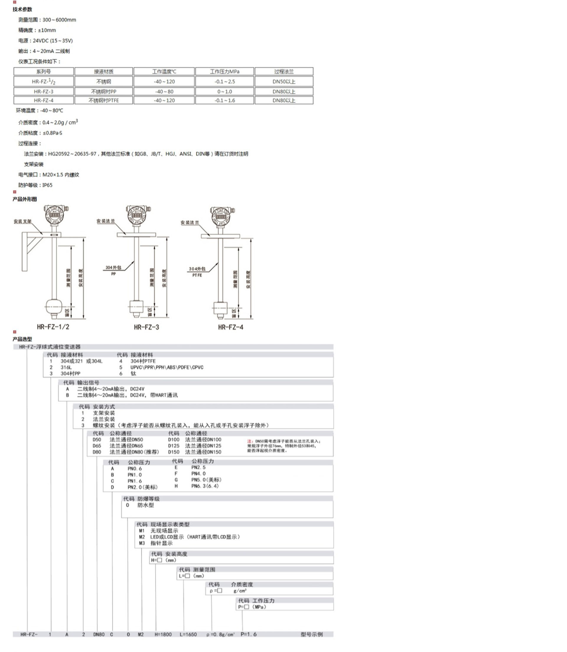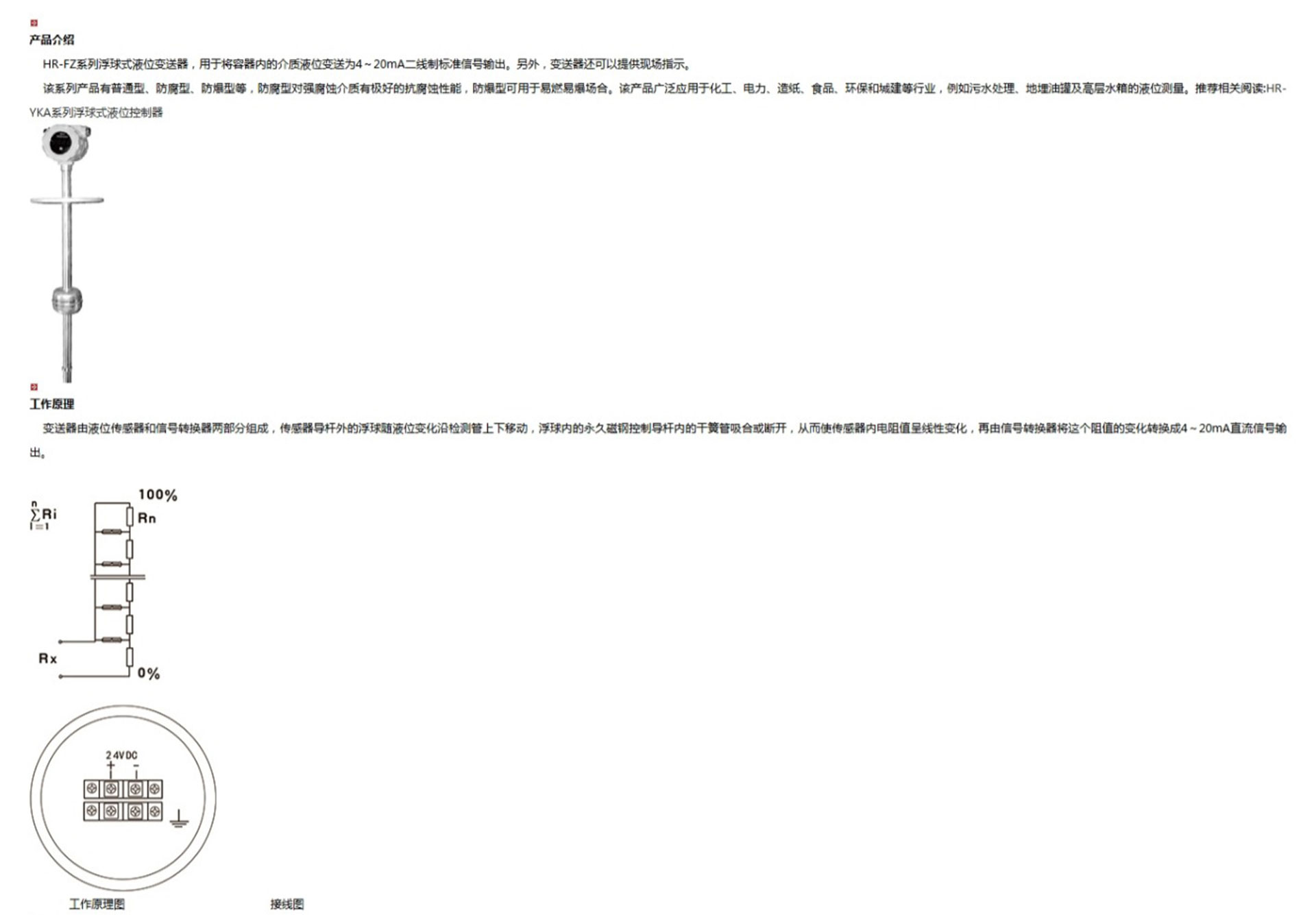 HR-FZ系列浮球式液位變送器,用于將容器內的介質(zhì)液位變送為4~20mA二線(xiàn)制標準信號輸出。另外,變送器還可以提供現場(chǎng)指示。